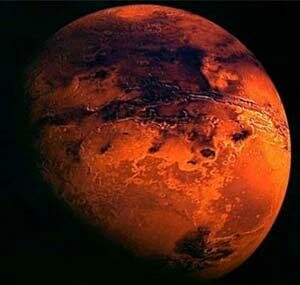 Марс – холодная и сухая пустыня. Цвет планеты обусловлен наличием оксида железа, который и делает эту планету красной. Около 2/3 занимают материки и примерно 1/3 – моря. В северном полушарии планеты расположены четыре марсианских вулкана Олимп, Павлина, Аскрийская, Арсия. Олимп занимает второе место по высоте во всей Солнечной системе, его высота составляет 27км. Марс вращается вокруг Солнца за 686,98 дней.