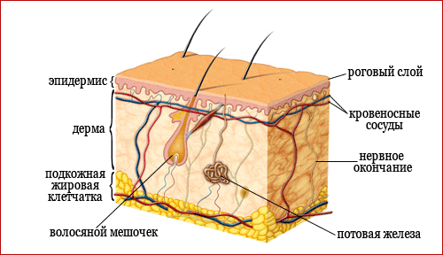 3) Подкожный слой – нижний слой кожи, в котором содержится жир, в нем также находятся кровеносные сосуды, корни волосяных фолликул и нервы. Если кожа сильно повреждена, то этот слой попытается залечить рану путем формирования рубцовой ткани. Ткань шрама не такая как нормальная ткань кожи. Она часто появляется обесцвеченная и не имеет потовых желез и волос.