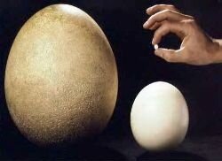 8. Самые большие яйца в мире несли недавно истребленные мадагаскарские птицы – Эпиорнисы. Вес одного яйца составлял 7,5-8 кг против страусиного яйца весом 1,65 кг. Рост самого крупного вида Эпиорнисов равнялся росту взрослого слона. На фото ниже изображены размеры самой большой в мире птицы по сравнению с человеком.